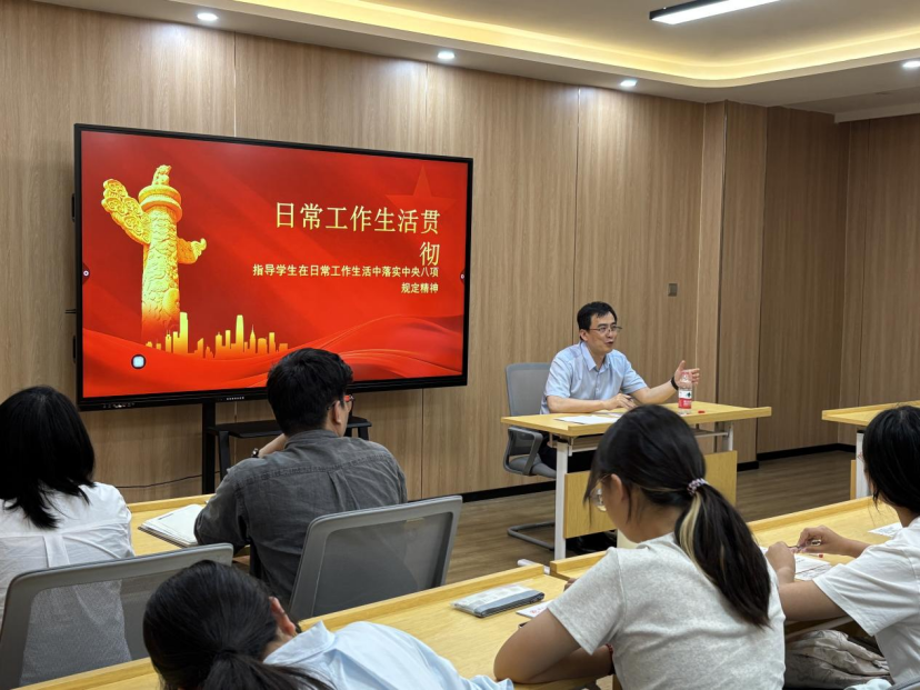 杨华就学生党员如何在日常工作生活中贯彻中央八项规定精神提出要求。一是要树立优良学风,发挥模范作用。刻苦学习专业知识,做到诚信考试、认真完成作业和科研任务。二是密切联系同学,服务同学成长。从小事小节中规范言行,在日常点滴中锤炼作风。三是弘扬勤俭节约,反对铺张浪费。带动身边同学共同养成节约的好习惯,营造文明健康的校园生活氛围。四是严守纪律规矩,保持清正廉洁。从学生时代起就增强纪律和规矩意识,扣好“第一粒扣子”。