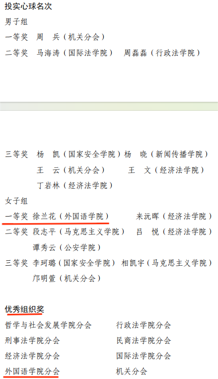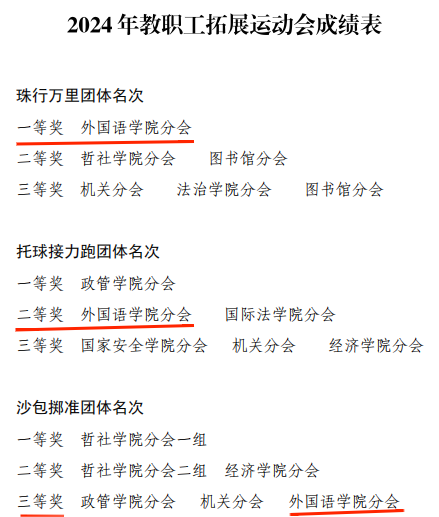 比赛中,我院教师队伍充分发扬拼搏精神,凭借着出色的团队协作和不懈的努力,最终,由马筱红、邓秋峰、史煜、包登玉、顾瑾组成的教师队伍获得珠行万里团体项目比赛一等奖;由李雪、张琳、秦婷、赵瑾组成的教师队伍获得托球接力跑团体项目比赛二等奖;由文小兵、霍瑛、柯菲、靳娟、马筱红组成的教师队伍获得沙包掷准团体项目比赛三等奖;徐兰花获得投实心球个人项目比赛女子组一等奖;我院分会获得优秀组织奖。