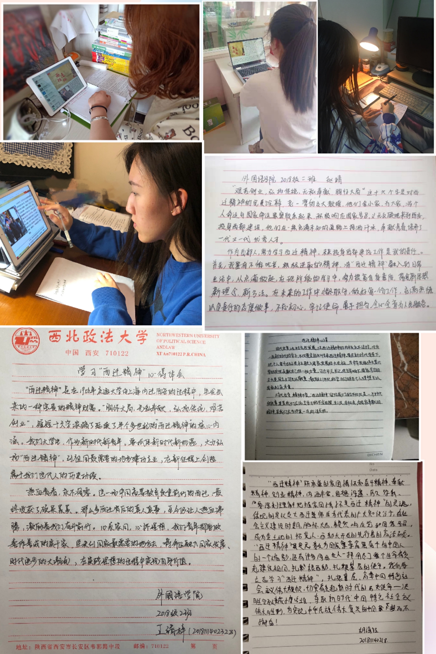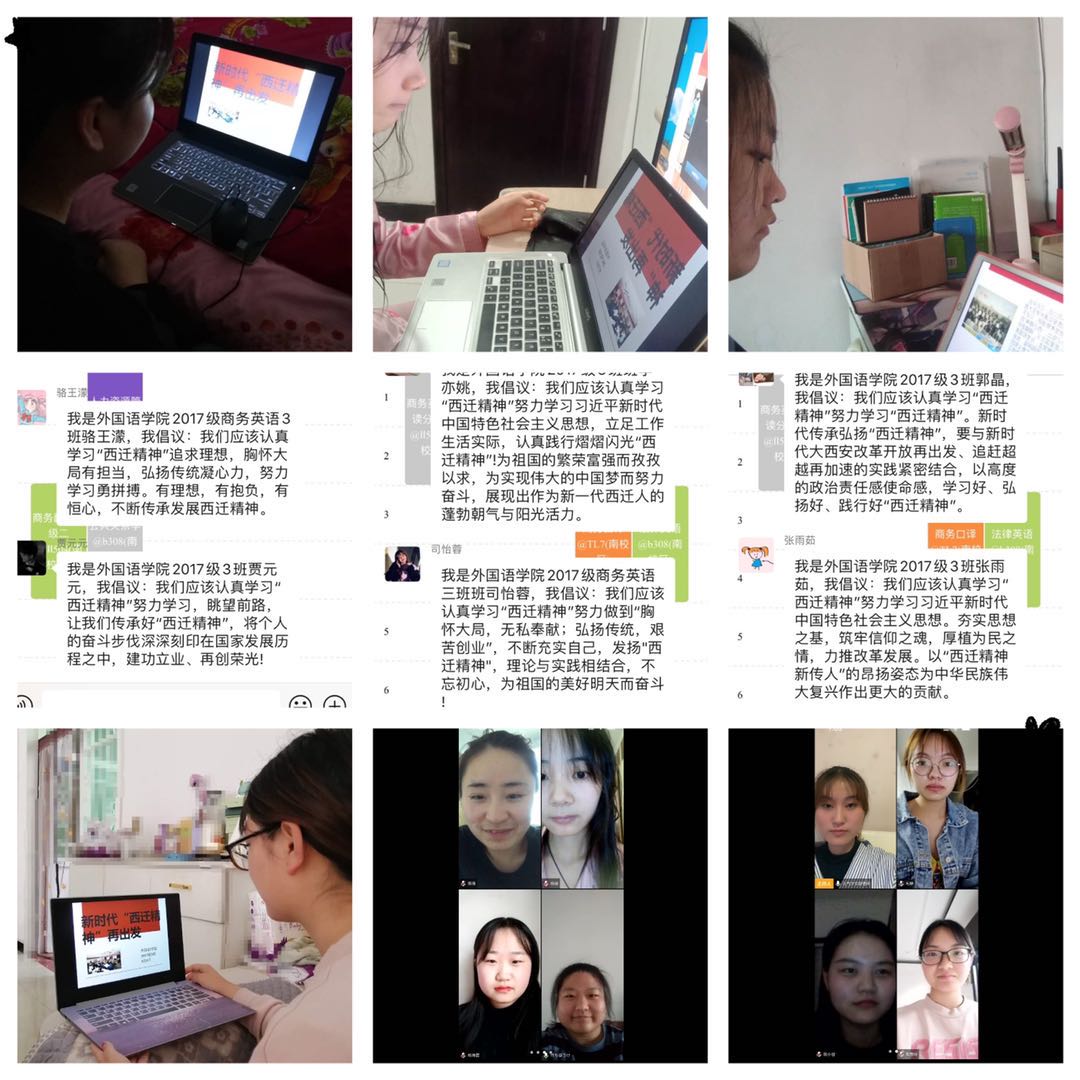 系列活动中,各年级辅导员在线领学了习近平总书记来陕考察时的重要讲话,回顾了“西迁精神”产生的历史背景,并结合当前国内疫情防控工作解读了“胸怀大局、无私奉献、弘扬传统、艰苦创业”的“西迁精神”内涵。 2019级学生开展了线上诗歌朗诵会,让同学们在琅琅诵读声中重温中国前进的路程,在回味经典中坚定对未来的信念,也表达了对祖国的热爱之情。2017级、2018级召开了主题班会,同学们纷纷发表自己的想法和认识,大家认为, “西迁精神”不仅属于西安交大,更是我们青年大学生的宝贵精神财富。时代在变迁,社会在发展,但西迁精神的内核永不过时。在这次抗击疫情的斗争中,以“90后”为代表的青年一代挺身而出、担当奉献,充分展现了新时代中国青年的精神风貌。同学们坚定表示,作为当代大学生,不仅要弘扬和传承西迁精神,更要亲身践行西迁精神。要在新时代背景下,把个人奋斗的小坐标融入国家发展的大坐标,为中华民族伟大复兴贡献自己的一份力量。会后,学生自发组织了倡议活动,并撰写了心得体会。