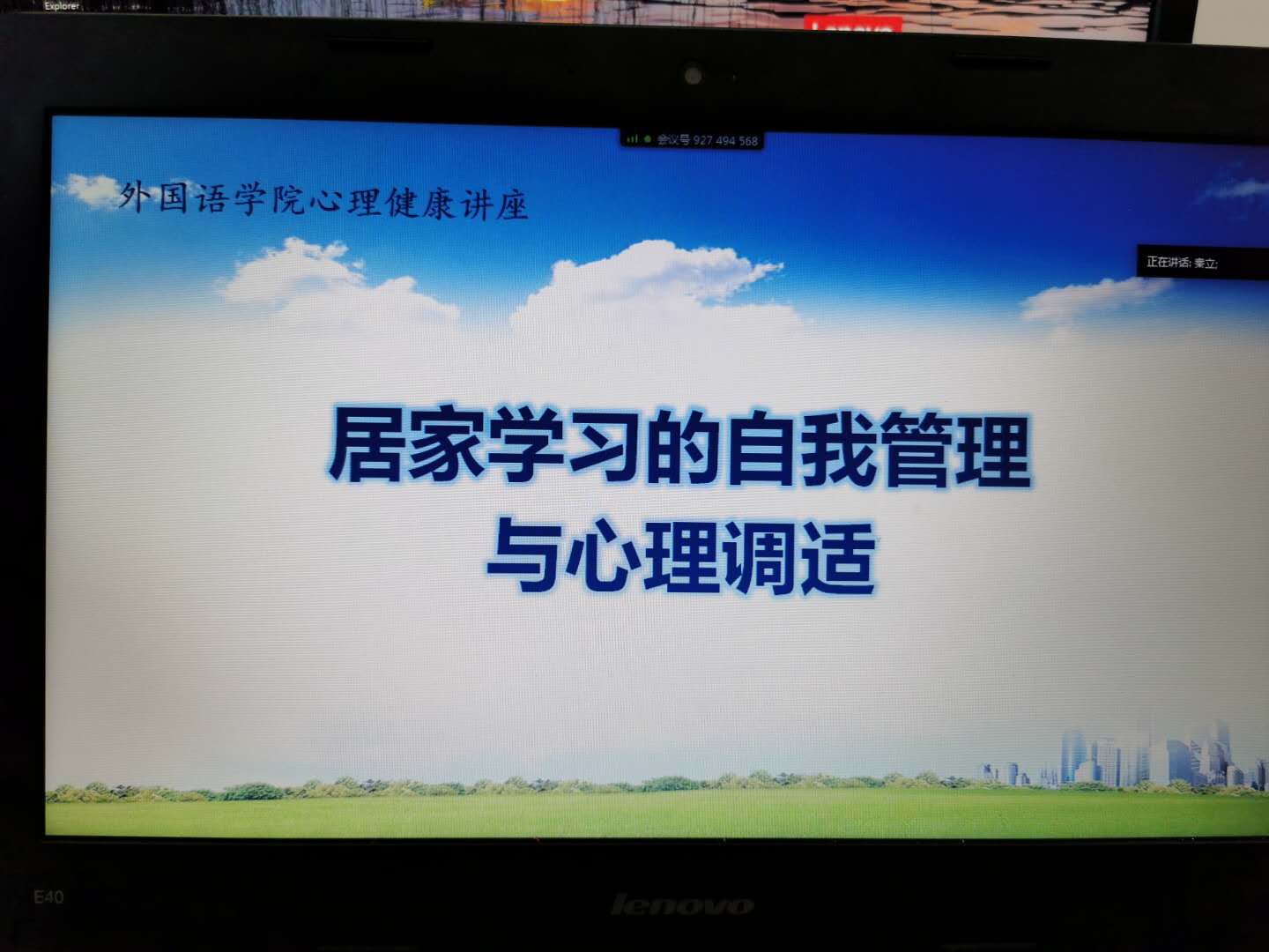 讲座中,秦老师和同学们聊了聊近期居家学习的状态,分析了网络学习的优缺点,针对同学们提出的在家学习效率低、注意力不集中、学习效果不好等问题,从“居家状态的自我评估”、“自我管理技巧”、“情绪调适技巧”三个方面对学生进行指导。