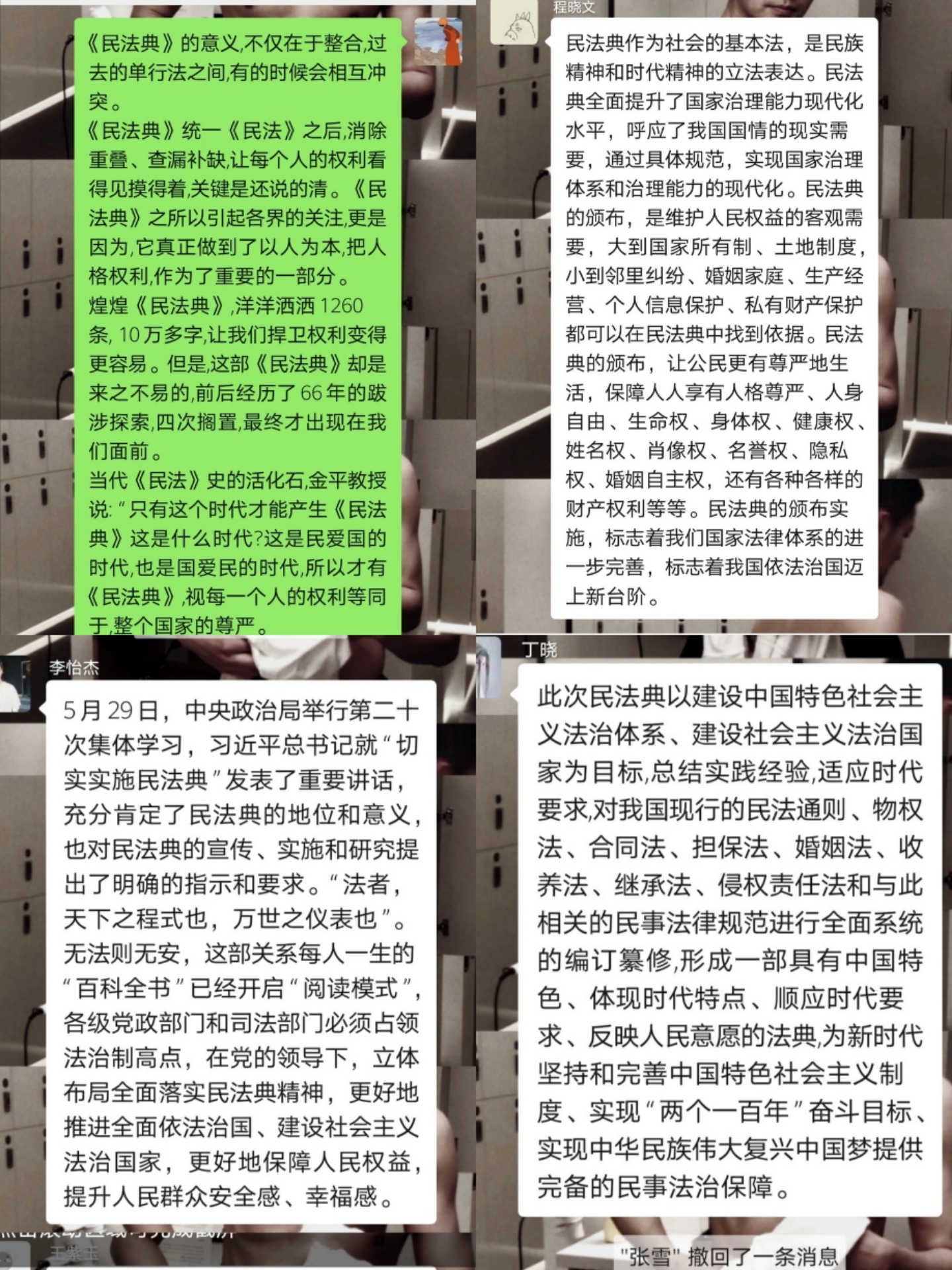 民法典是新中国成立以来第一部以“法典”命名的法律,是新时代我国社会主义法治建设的重大成果。2138CC太阳集团于6月14日至6月17日采用线上学习讨论的方式,分批组织2019级、2018级、2017级学生集体学习《中华人民共和国民法典》,目的在于向学生宣传民法典实施的重大意义,让学生认识到民法典全面提升了国家治理能力现代化水平,呼应了我国国情的现实需要,通过具体规范,实现国家治理体系和治理能力的现代化。