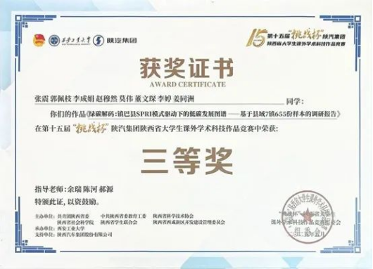 5月24日下午,由共青团陕西省委、省委教育工委、省科协、省社会科学院、省学联、西咸新区管委会联合主办,西安工业大学承办的第十五届“挑战杯”陕汽集团陕西省大学生课外学术科技作品竞赛闭幕式暨颁奖仪式在西安工业大学未央校区举行。由学院余瑞、陈河、郝源三位教师指导,2022级本科生张震负责的《绿碳解码:镇巴县SPRI模式驱动下的低碳发展图谱——基于县城7镇655份样本的调研报告》荣获省赛决赛三等奖。