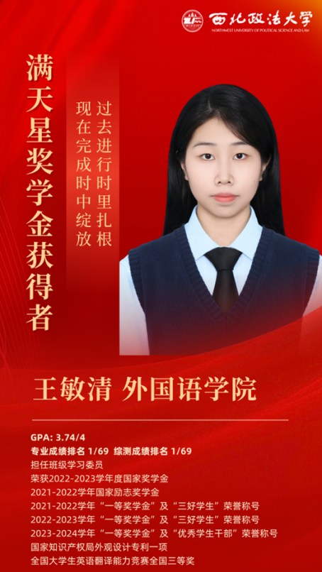 王敏清以“过去进行时里扎根,现在完成时中绽放”为主题,回顾了四年求索路。学业上,连续三年成绩专业前 3%、综测专业第一;创新实践中,不断探索,拥有国家外观设计专利,开展省级大创立项项目,获学科竞赛奖项10余项,荣获国家奖学金、校级三好学生等十余项荣誉。公益服务方面,坚持为山区小学开展线上支教,用行动回馈社会,展现西法大学子担当。
