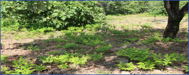 7月14日上午,实践团队来到镇安县云盖寺镇东洞村“林下套种”模式的种植基地,该模式利用板栗树和核桃树遮阳特性为魔芋创造适宜生长环境,同时魔芋根系帮助林地保水保肥,形成“一树一芋”的生态循环。这种种植方法充分利用林地和魔芋喜阴怕潮的特点,同时增加了魔芋种植的面积,增加经济效益。据了解,这种模式已在镇安广泛推广,通过“企业+基地+农户”机制,既保障了魔芋原料供应,又让农户实现“一份土地两份收益”,成为当地践行“生态富民”的生动实践。