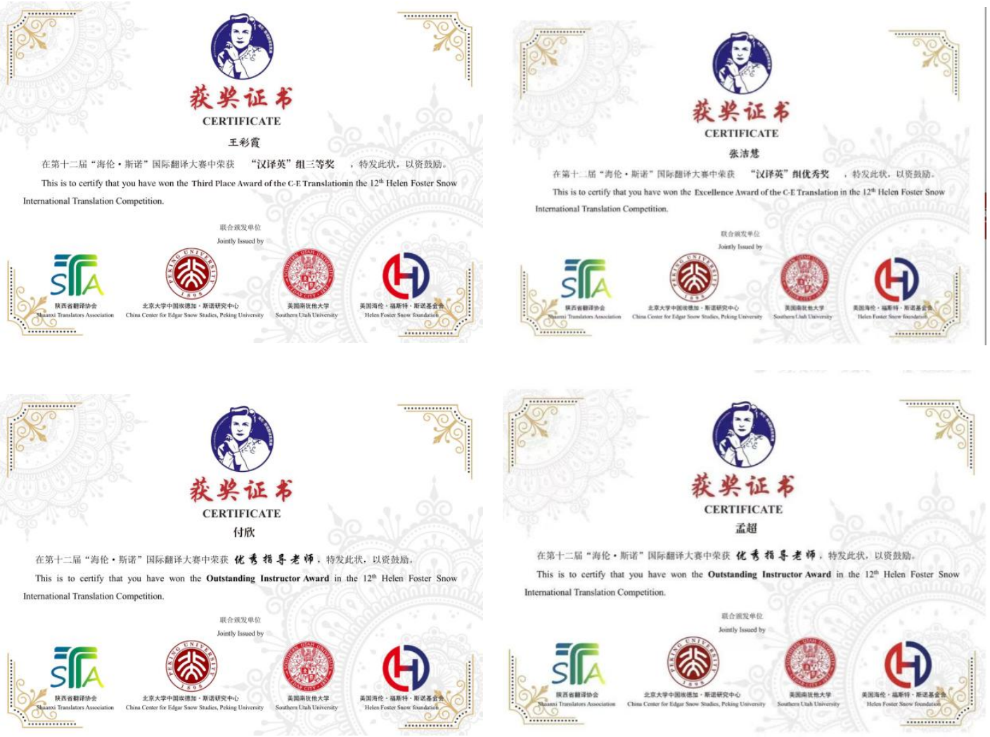 近日,第十二届“海伦·斯诺”国际翻译大赛组委会公布获奖名单,我院2023级研究生王彩霞、2024级研究生张洁慧分获汉译英组三等奖、优秀奖,学院法律翻译中心主任付欣副教授,英语系主任、MTI教育中心副主任孟超博士获得“优秀指导教师”荣誉称号。