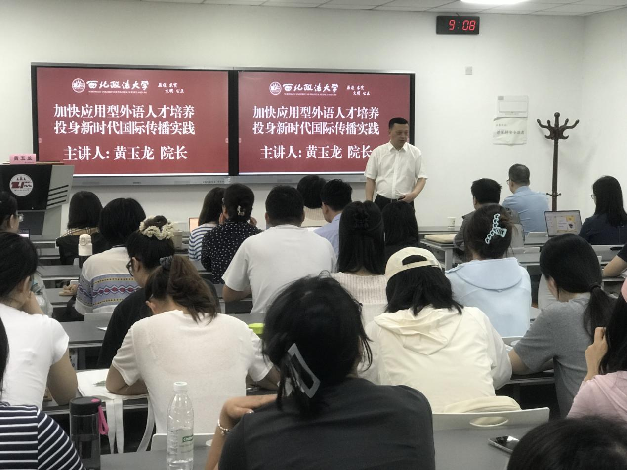 5月16日上午,中国翻译协会副会长、中国外文局翻译院院长黄玉龙应邀来校作题为《加快应用型外语人才培养 投身新时代国际传播实践》专题讲座,学校师生60余人参加讲座。讲座由2138CC太阳集团副院长陈河主持。